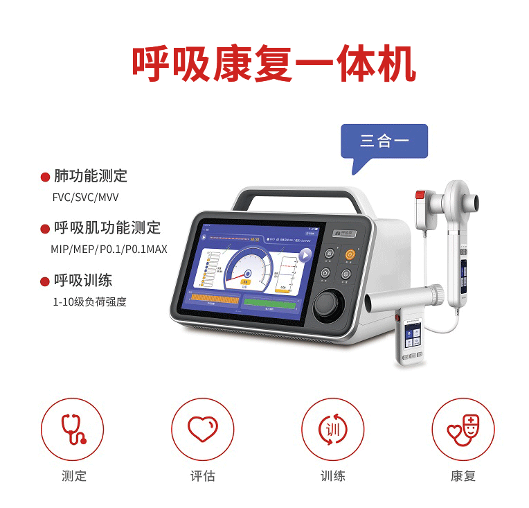 首次亮相呼吸康复一体机TX,具备测定、评估、训练、康复功能,可用于肺功能测定、呼吸肌功能测定、呼吸训练,同时具有5大核心优势:
