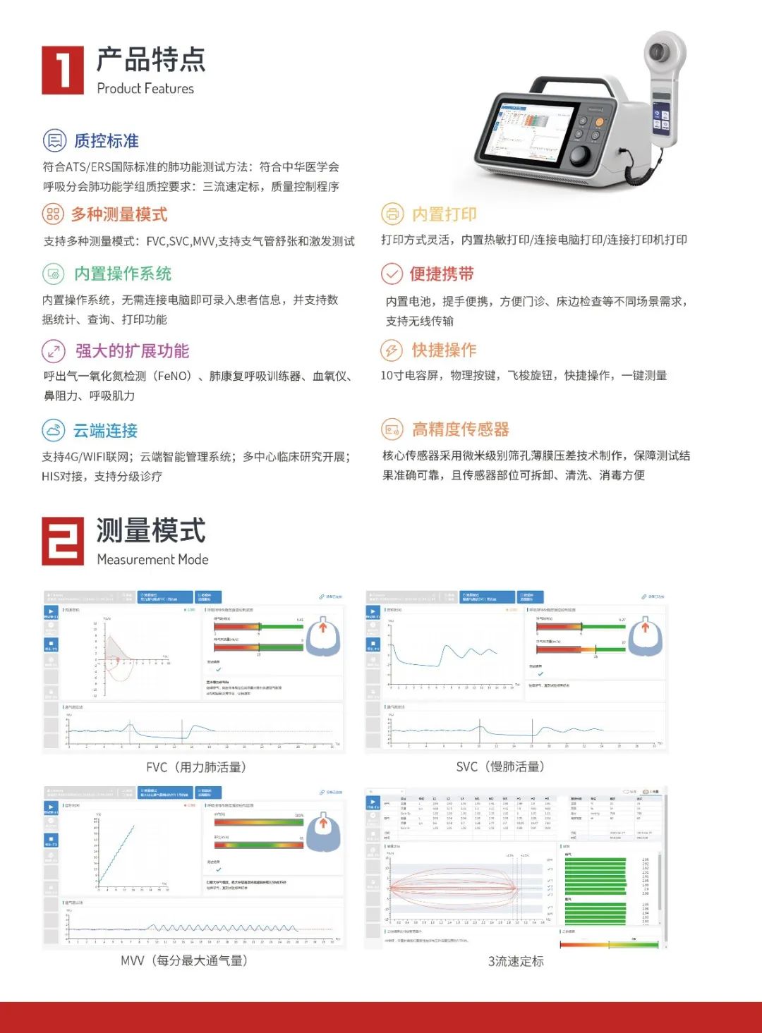 它的核心传感器采用微米级别筛孔薄膜压差传感器制作,支持三流速定标,能够实时显示呼吸动态曲线,对肺功能检查质量进行自动质控、智能分析结果,提供单机连网双模系统。